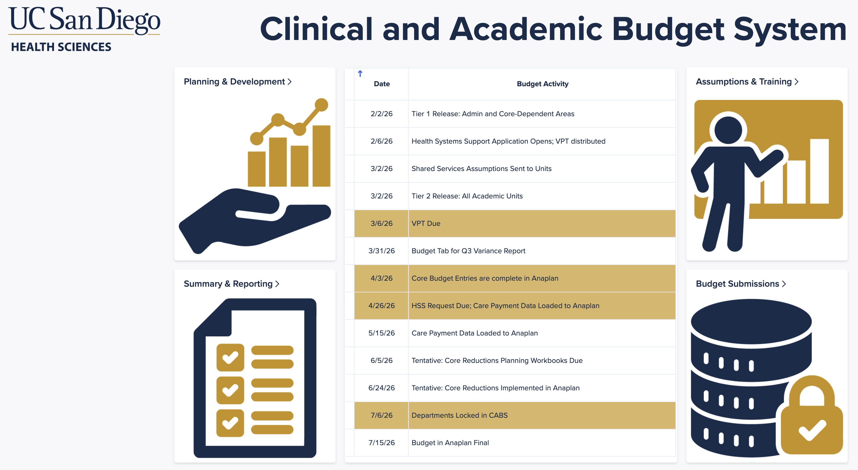 Budget & Analysis supports the annual budgeting process for UC San Diego Health Sciences, and provides services for budgeting guidance, parameters and analysis, as well as training, coordination and consolidation of budgets for the professional schools, academic departments, programs/institutes, and administrative units.
